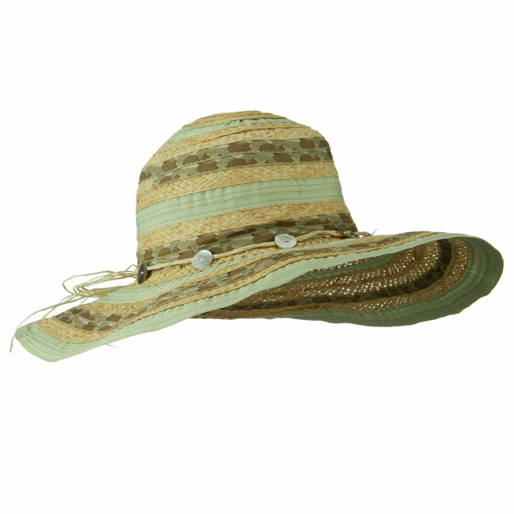 Our Ribbon And Raffia Shell Button Wide Brim Hat is cool summer hat for ladies. This lightweight raffia straw hat will ensure your head to stay in cool condition all the time as well as the hat will provide you great sun protection. This natural colored crochet straw hat shows its distinctive design around the crown and brim of the hat with shell button details and camo pattern stripes. The self-tie string around the crown adds the taste of countryside for lovely style. This is wonderful ladies Ribbon And Raffia Shell Button Wide Brim Hat for any outings such as picnics, beach, gardening, tea parties, and others. Make sure to get one before summer ends.