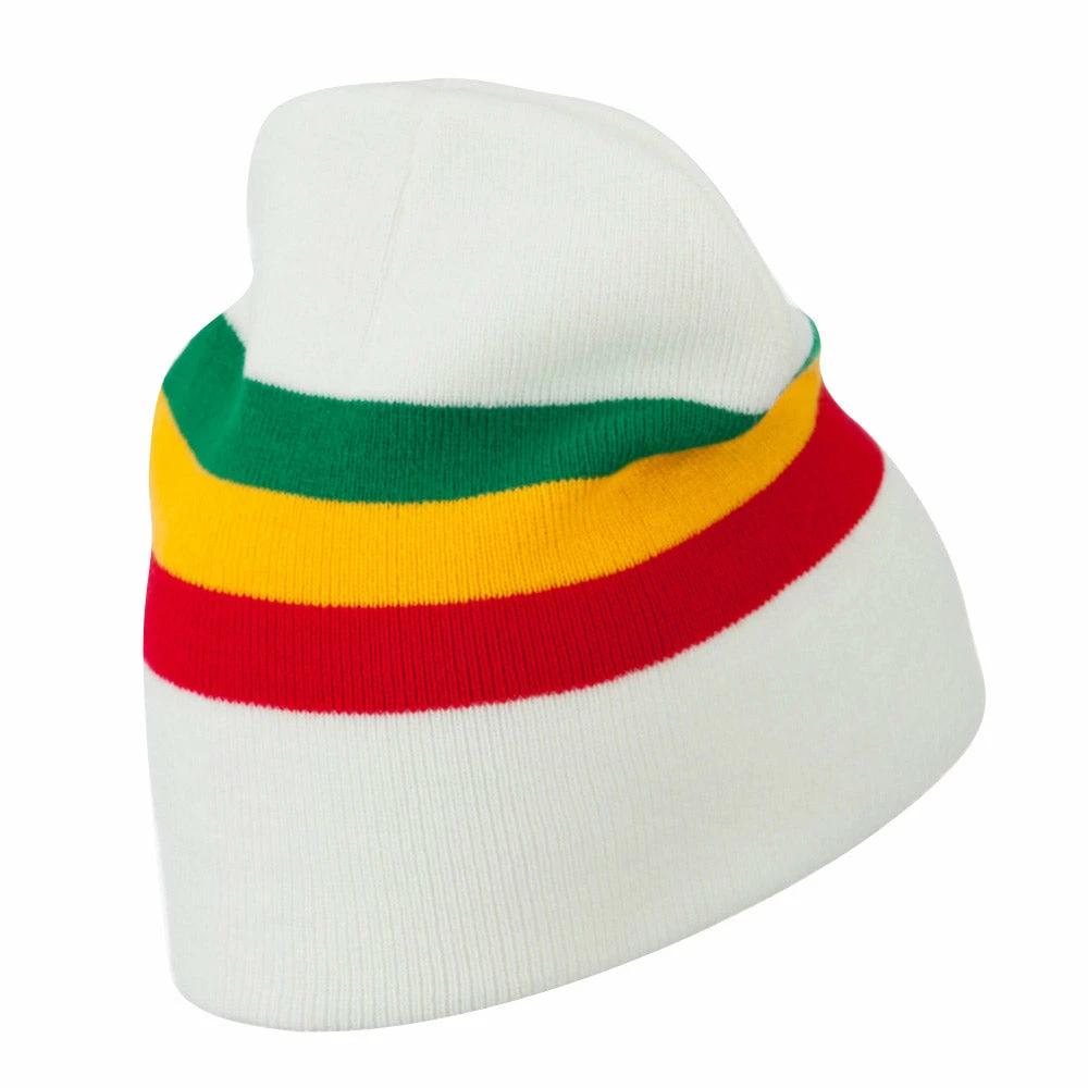 Green, yellow, and red stripes featured throughout the beanie.
