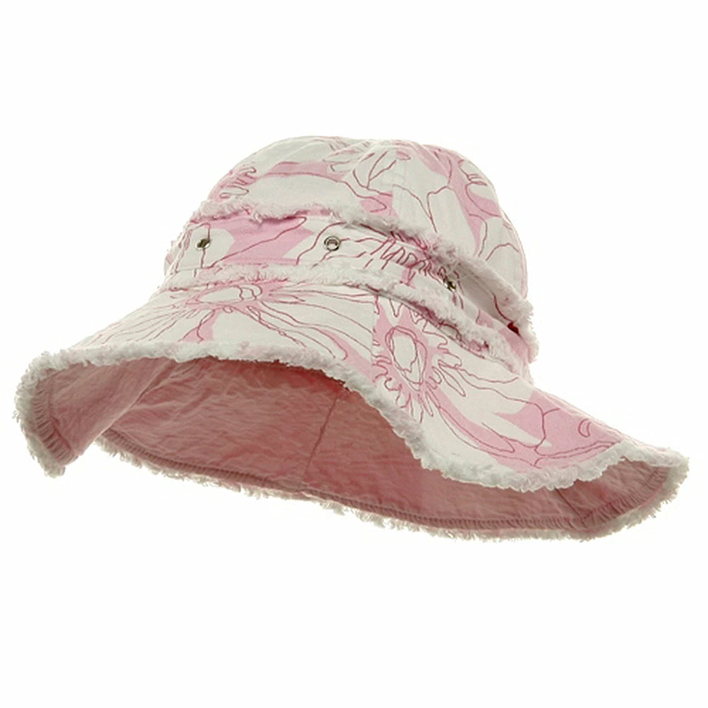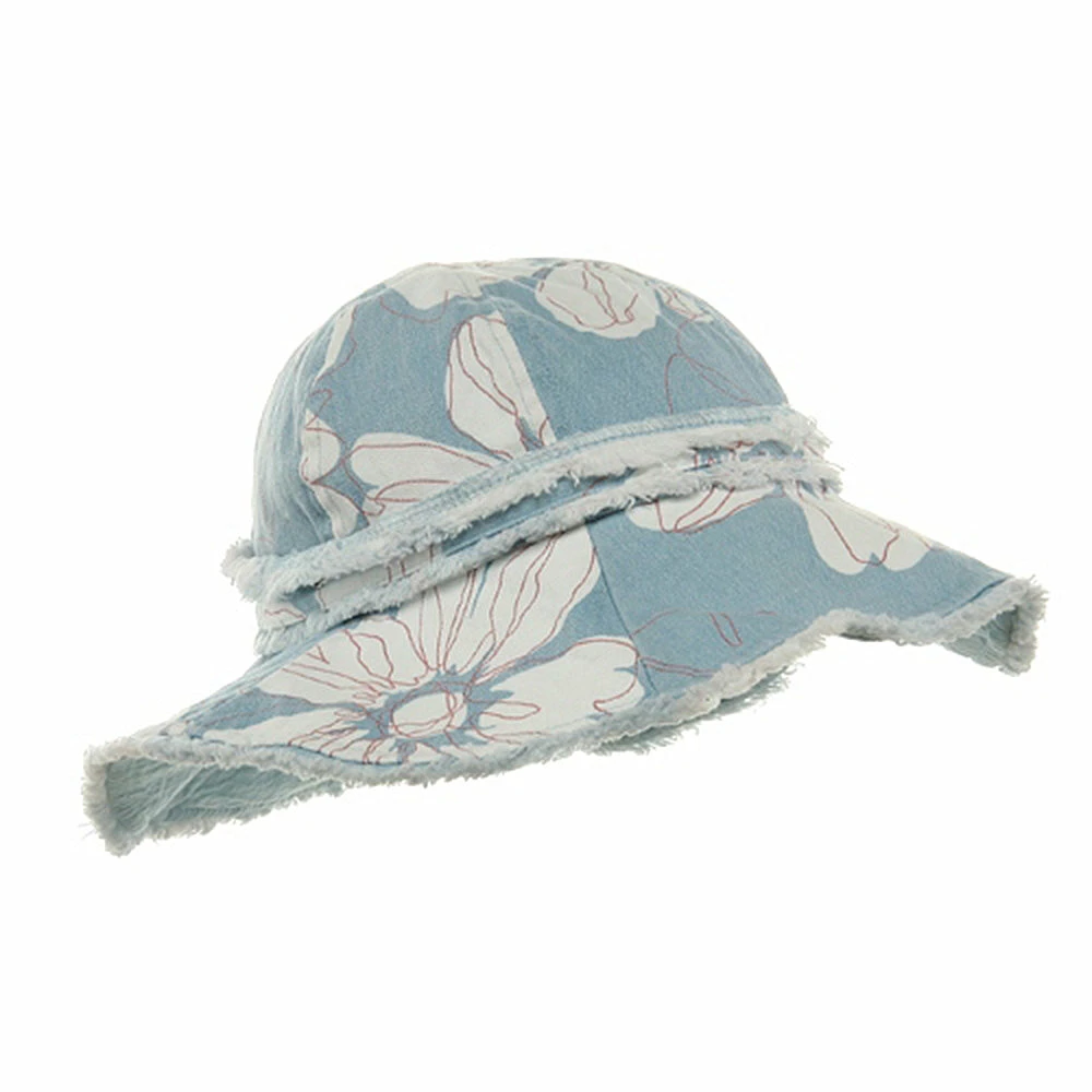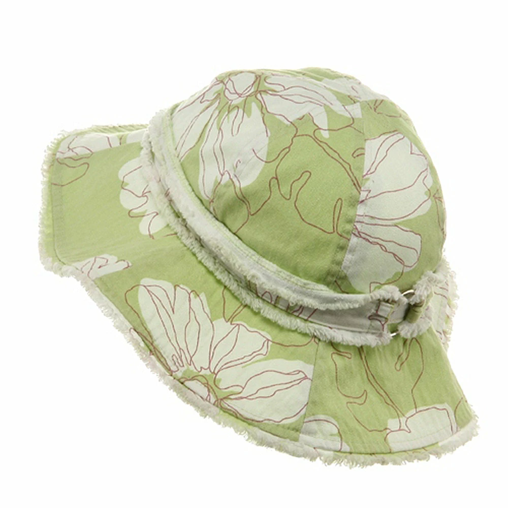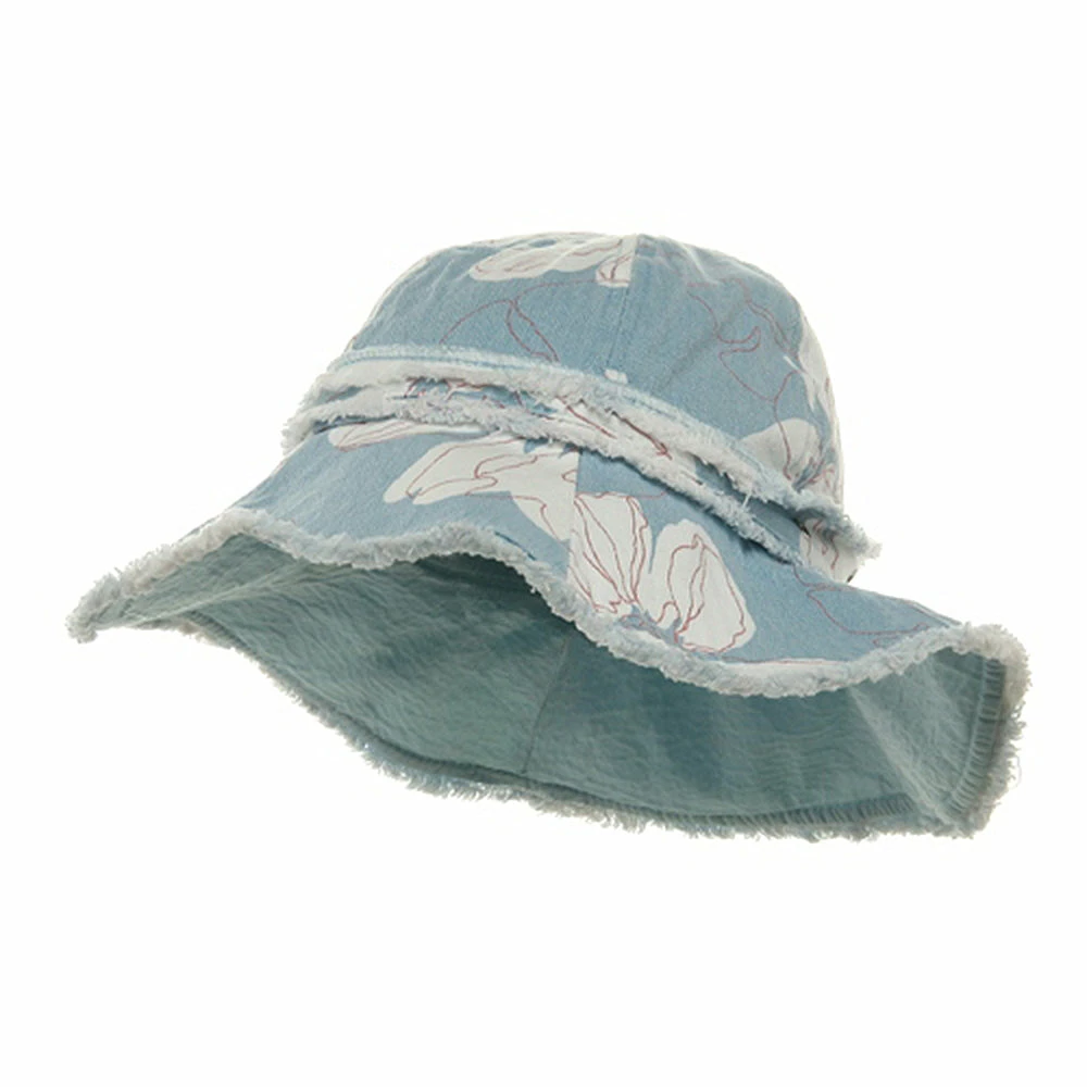 Try a relaxed summer look this season in our printed canvas ladies hat. Made from 100% cotton, this lighthat is covered in a white tropical floral printing, transporting you head to a far away paradise. Featuring a fully line 4″ deep crown, with decorative studded hat band, and a 4″ wide floppy frayed brim, this hat is the perfect accessory to any casual outfit or beach bum look. So grab you surfboard and towels and get ready to hit the sand in this soft and durable hat, sure to last you make summer memories to come.