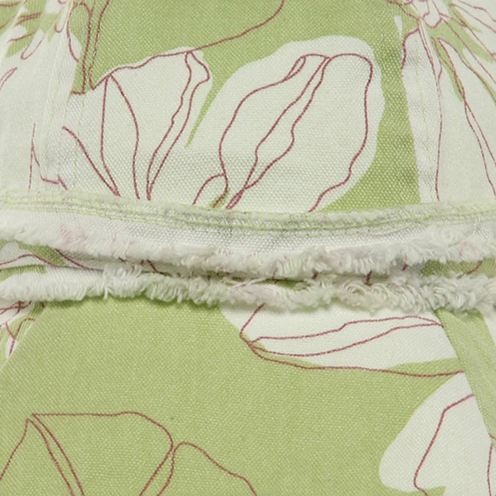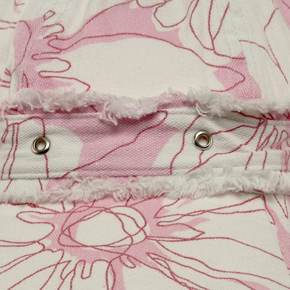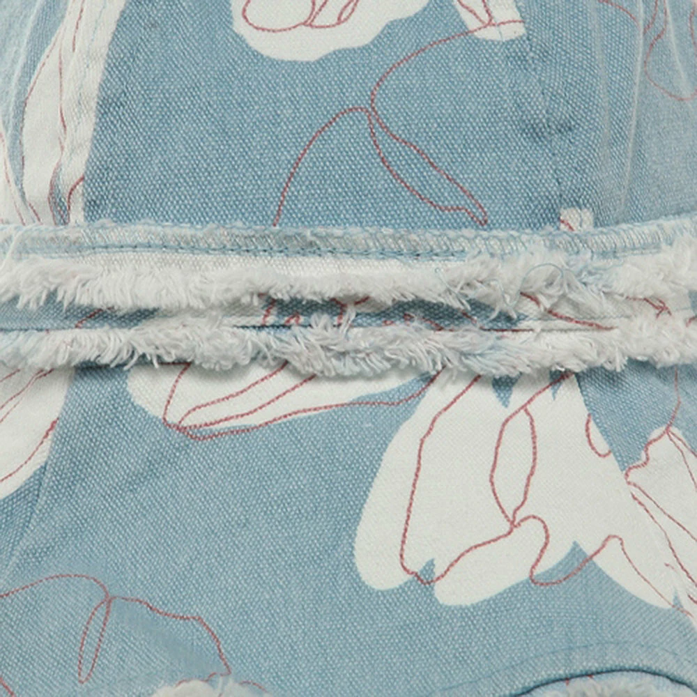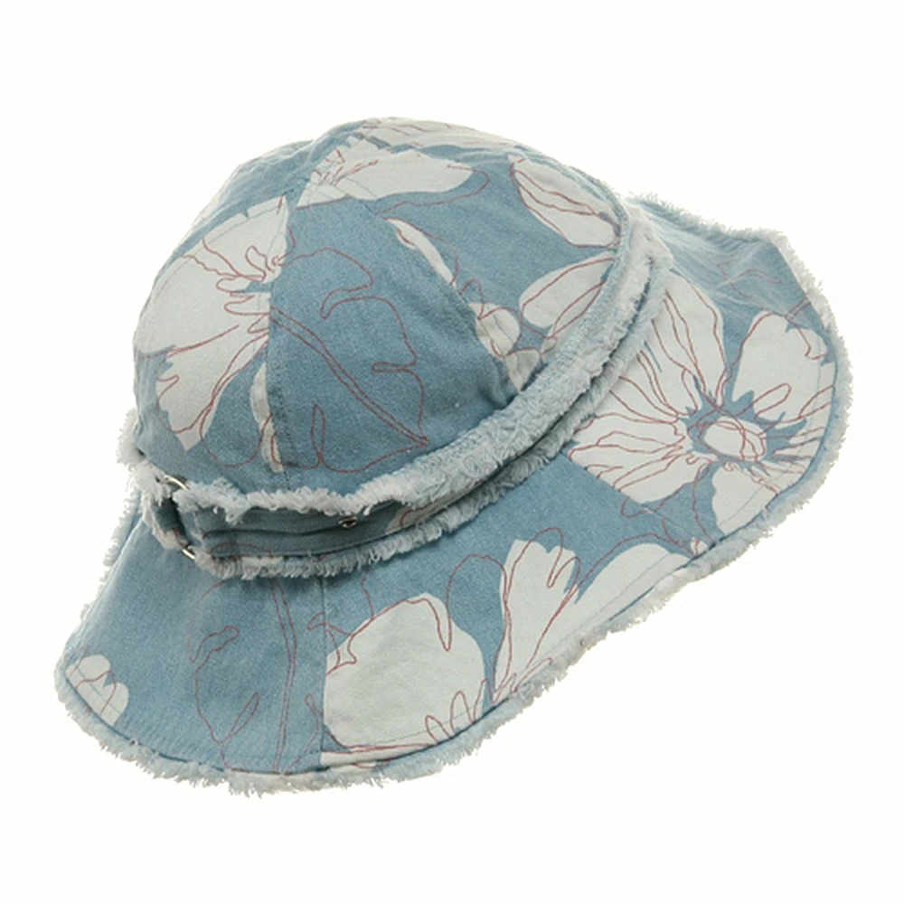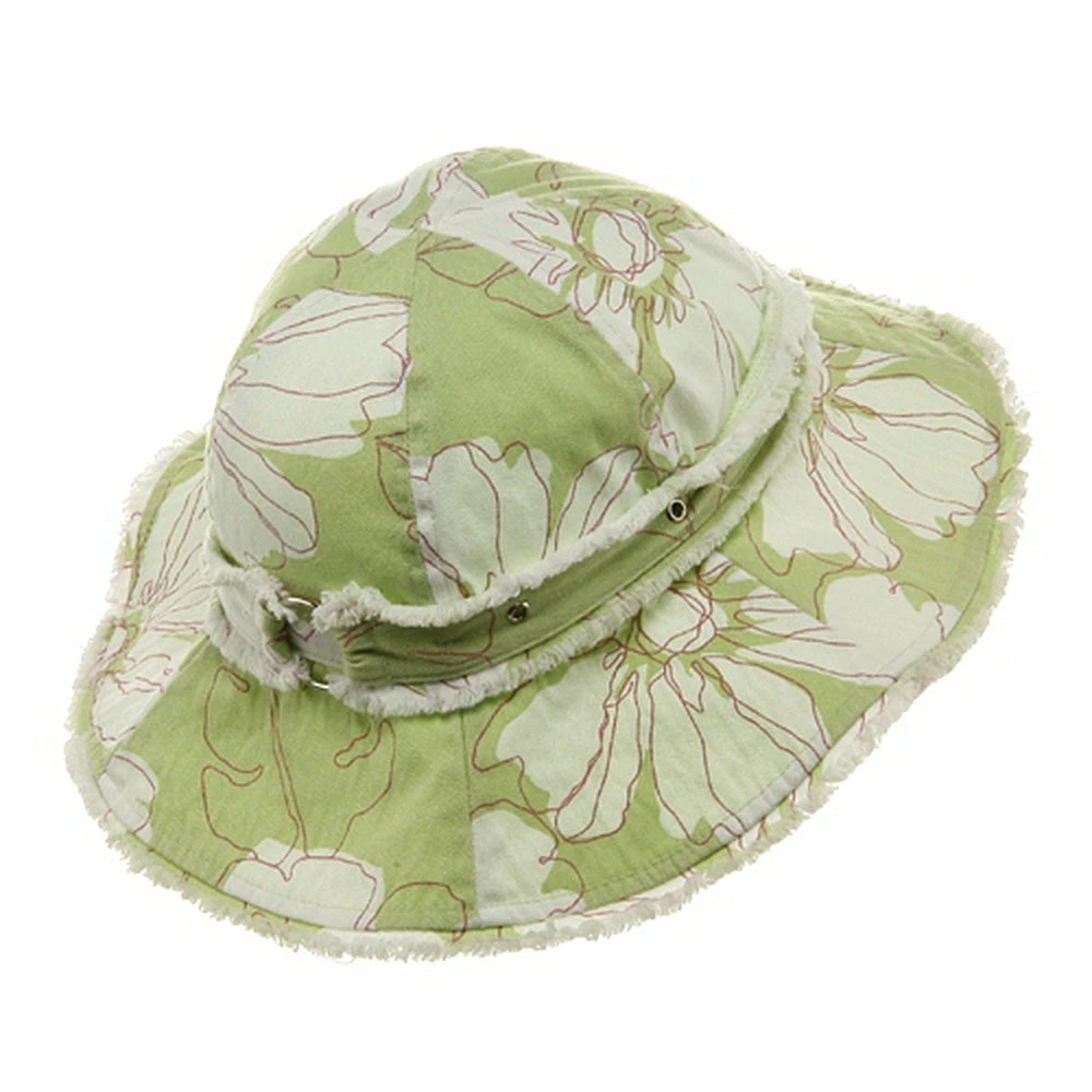 Try a relaxed summer look this season in our printed canvas ladies hat. Made from 100% cotton, this lighthat is covered in a white tropical floral printing, transporting you head to a far away paradise. Featuring a fully line 4″ deep crown, with decorative studded hat band, and a 4″ wide floppy frayed brim, this hat is the perfect accessory to any casual outfit or beach bum look. So grab you surfboard and towels and get ready to hit the sand in this soft and durable hat, sure to last you make summer memories to come.