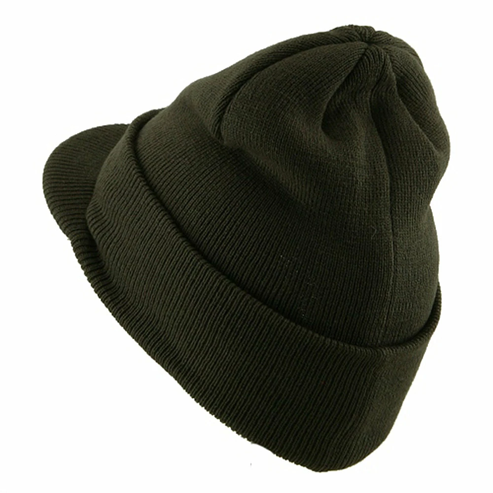 Softly double layered for warmth, with a cuff and visor, this hip solid khaki beanie is dressed up for urban wear throughout the winter.Made of soft to the touch acrylic, in a tight fine knit, the crown is constructed out of 1 panel of stretchable fabric, with 6 shaping stitches at the top of the crown to give it its beautiful round shape. Generous in size and flexible enough to fit any head shape, the hat can be worn down over the ears for more coverage, or up above the ears for less coverage. The 2 ply design will keep the weather at bay while the ample 2 3/4 inches visor protects you from the sun and wind. Available in 20 different colors.