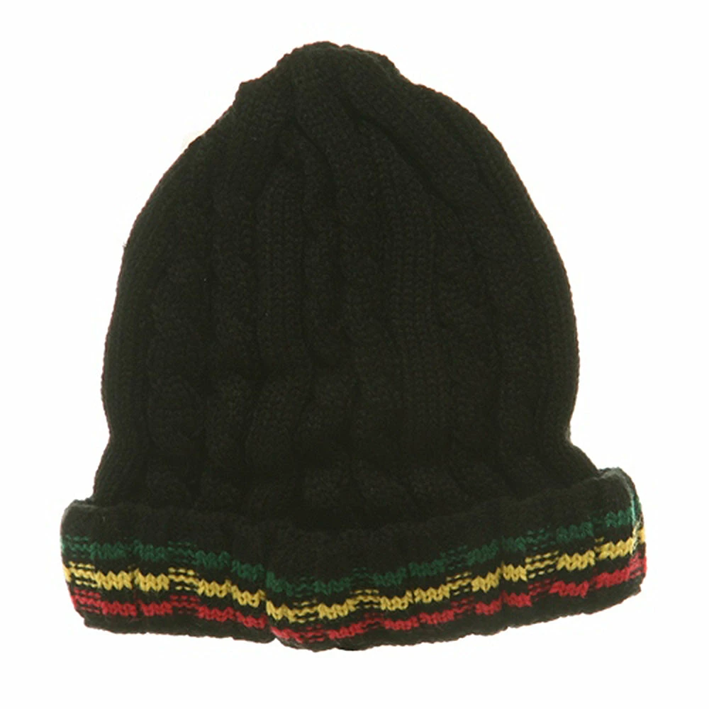 Thick and chunky with an ample cuff for added style, thisTwo Tone Cuff Twister Ski Beanie will keep you comfortably warm throughout the winter.The round crown is constructed out of 1 panel of soft cable knit, giving this hat an ultimate amount of stretch and flexibility to fit every head shape.The 2 inches cuff can be adjusted to meet your need for coverage.Also, on the cuff of this beanie, three rasta stripes are accented with colors of red, yellow and green.This lightweight basic beanie will keep the cold weather out while keeping your warmth under your hat with classic style.Available in grey and khaki beanies with rasta stripes on the cuff.