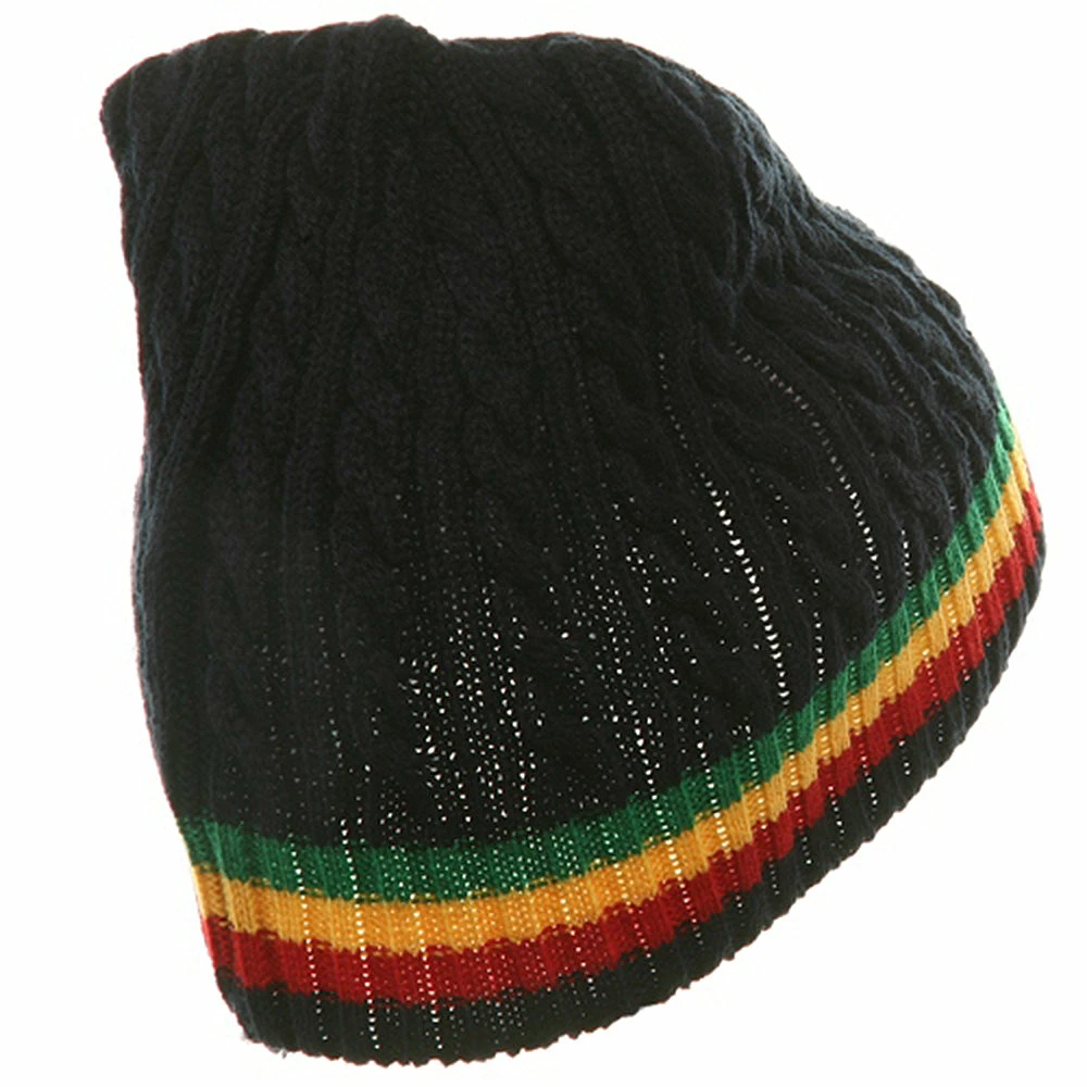 Cables and ribs adorn this soft knit, adding tactile texture to its soft navy color.Constructed out of 1 panel of medium acrylic cable knit fabric, thisTwister Skully Beanie offers a smooth round shape with enough stretch and flexibility to fit children as well as adults, with ease.The opening of this hat is accented with rasta stripes of green, yellow and red.It is lightweight and easily packed, this hat is ideal for travel with its insulating softness.Available in 3 appealing colors with rasta stripes accented on this beanie.