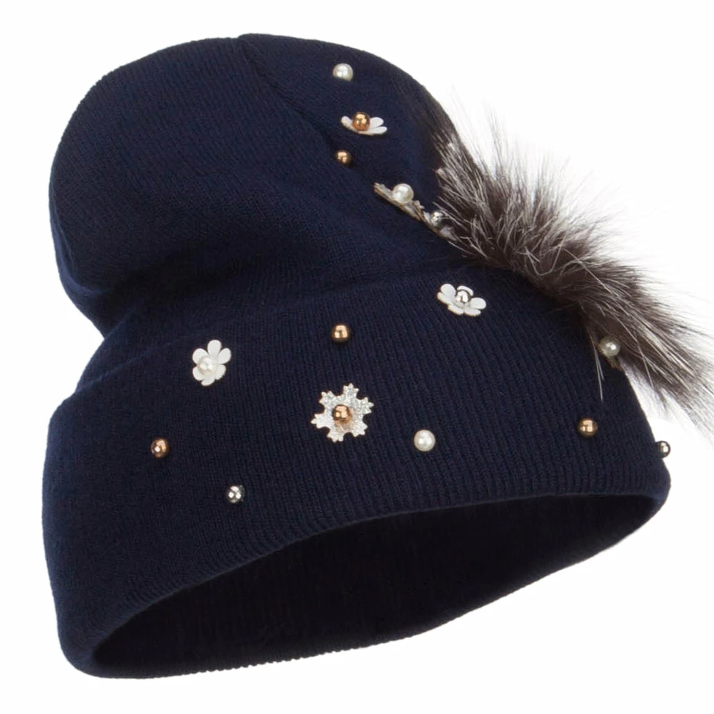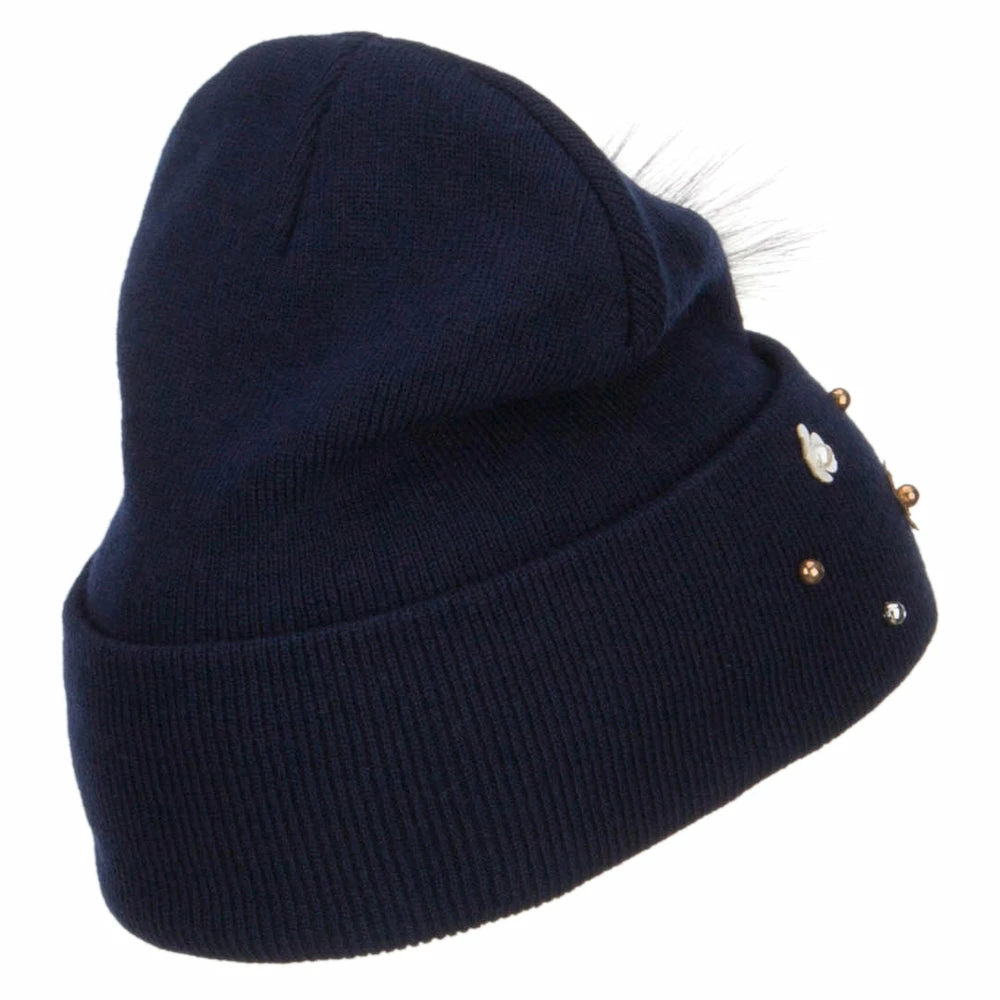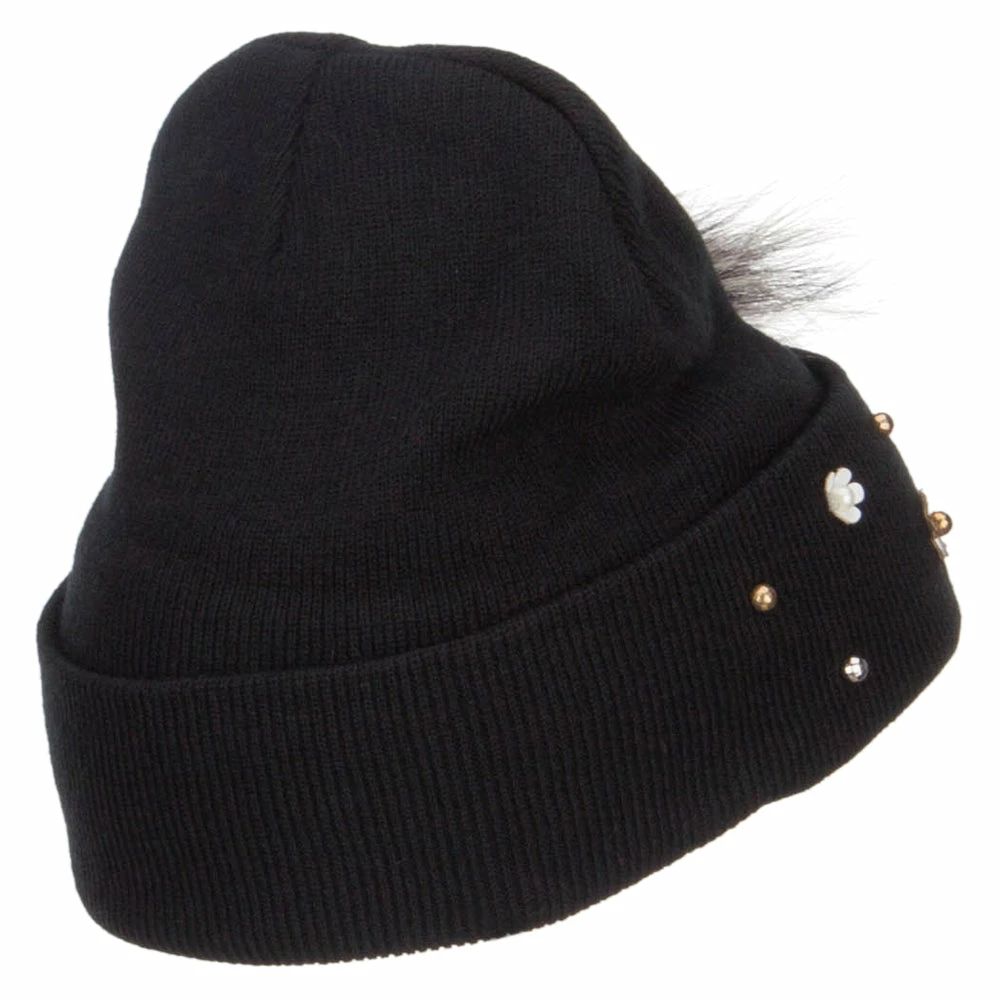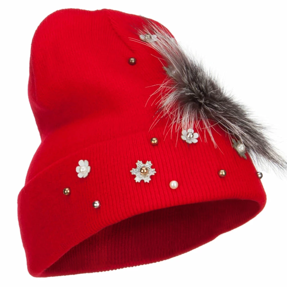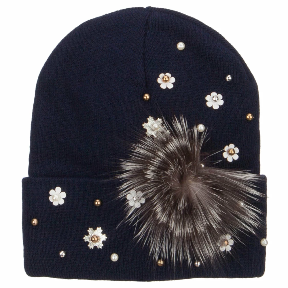 Fur accented knit long beanie hat for ladies.