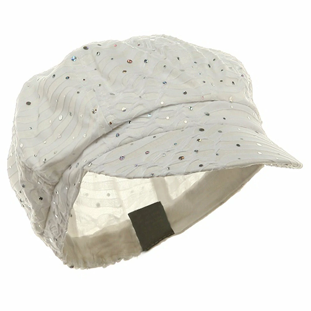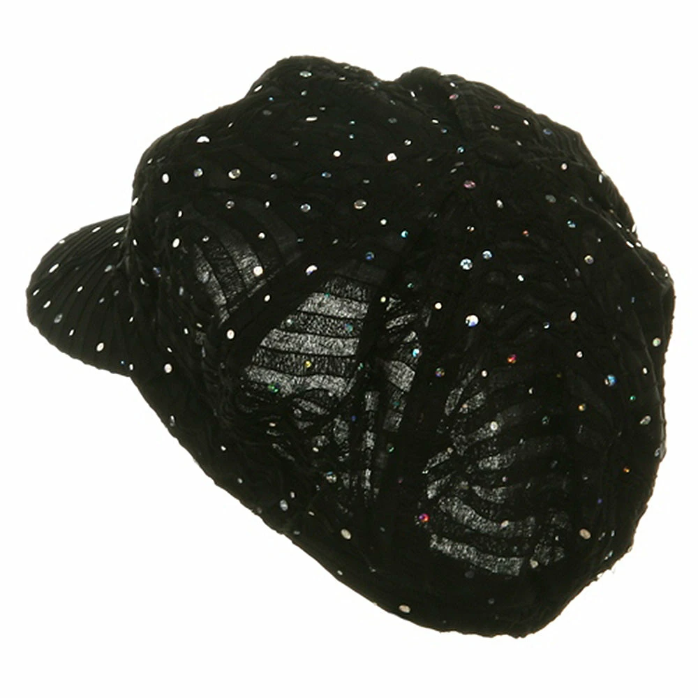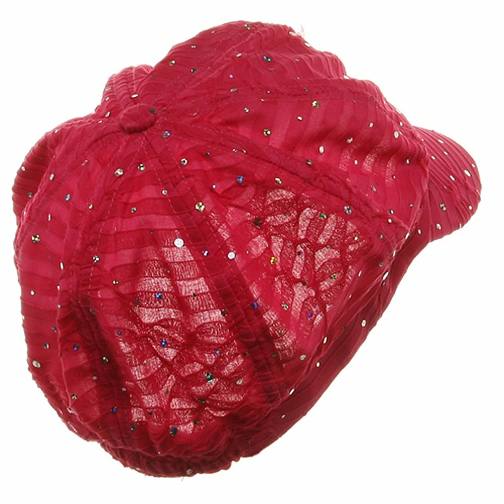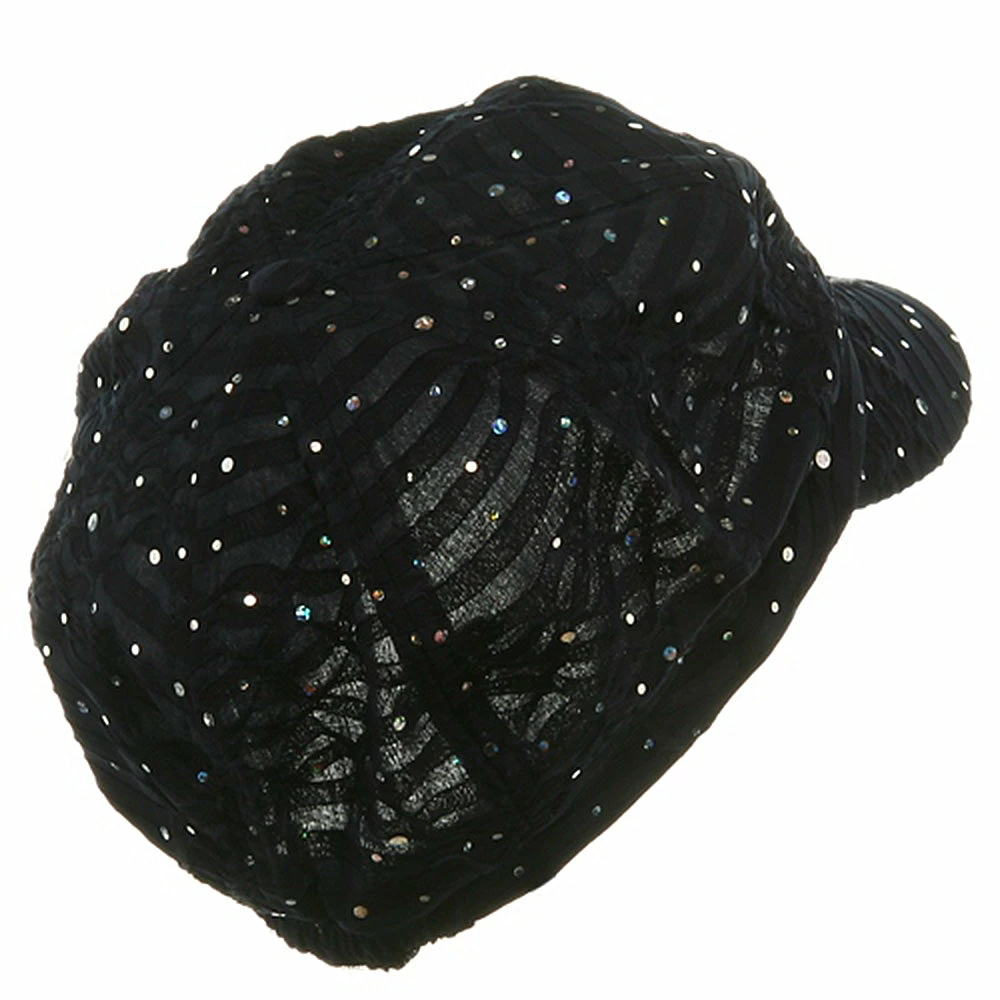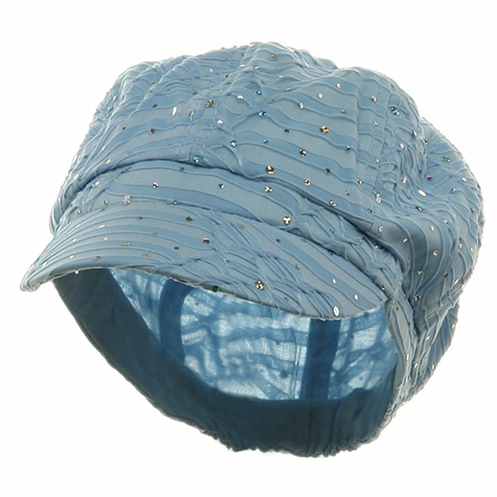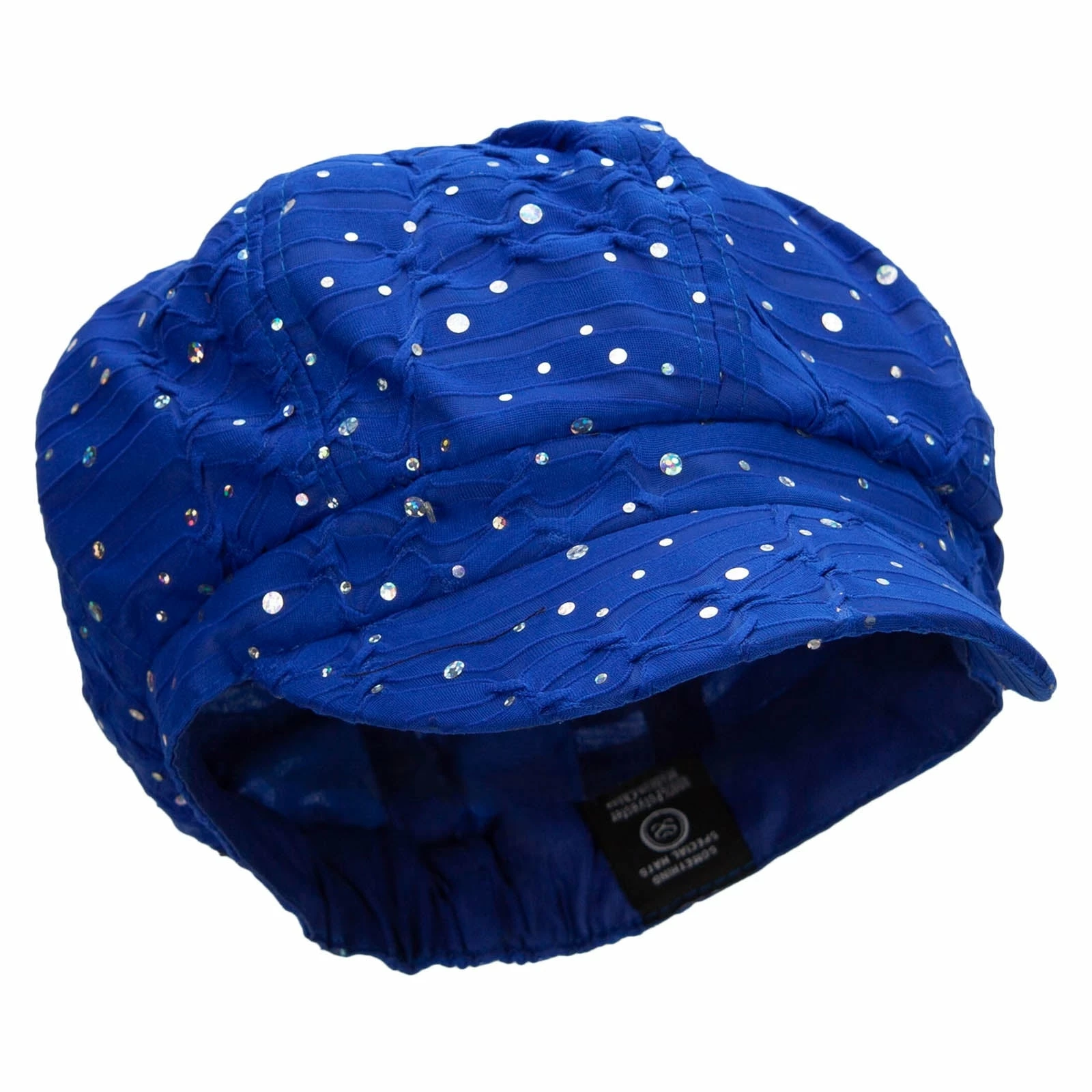 Allow yourself to sparkle and shine in our Glitter Newsboy cap. Made from a unique blend of cotton and metallic, this thin ribbed and textured hat combines the traditional look of a newsboy cap, with a modern and glamorous touch. Featuring 8 panels with a button top, this roomy 4″ deep crown is sprinkled with holographic dots from the tip of the 2 1/4′” long bill to the elastic closure in the back . Fully lined for your added comfort and luxury, this hat is definitely for those who love to make a statement. So go ahead and let yourself shine in any one of these great colors. Just be warned sunglasses are not included!