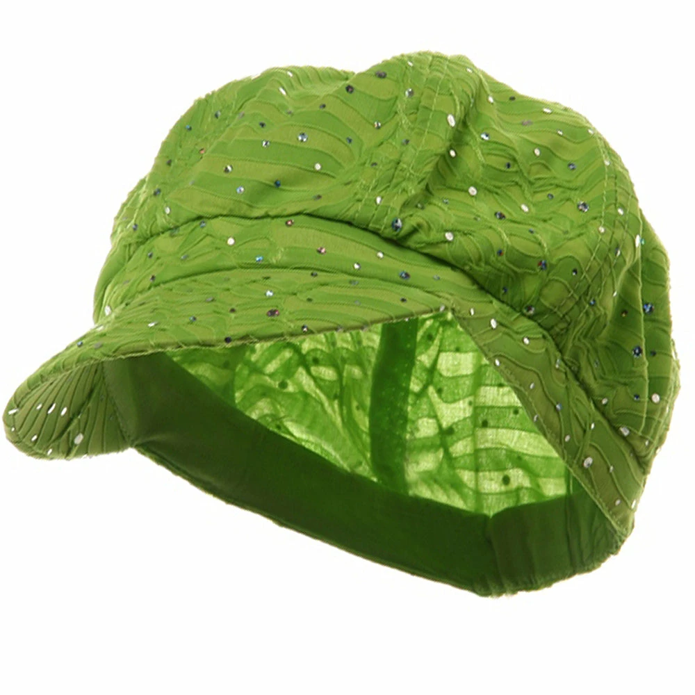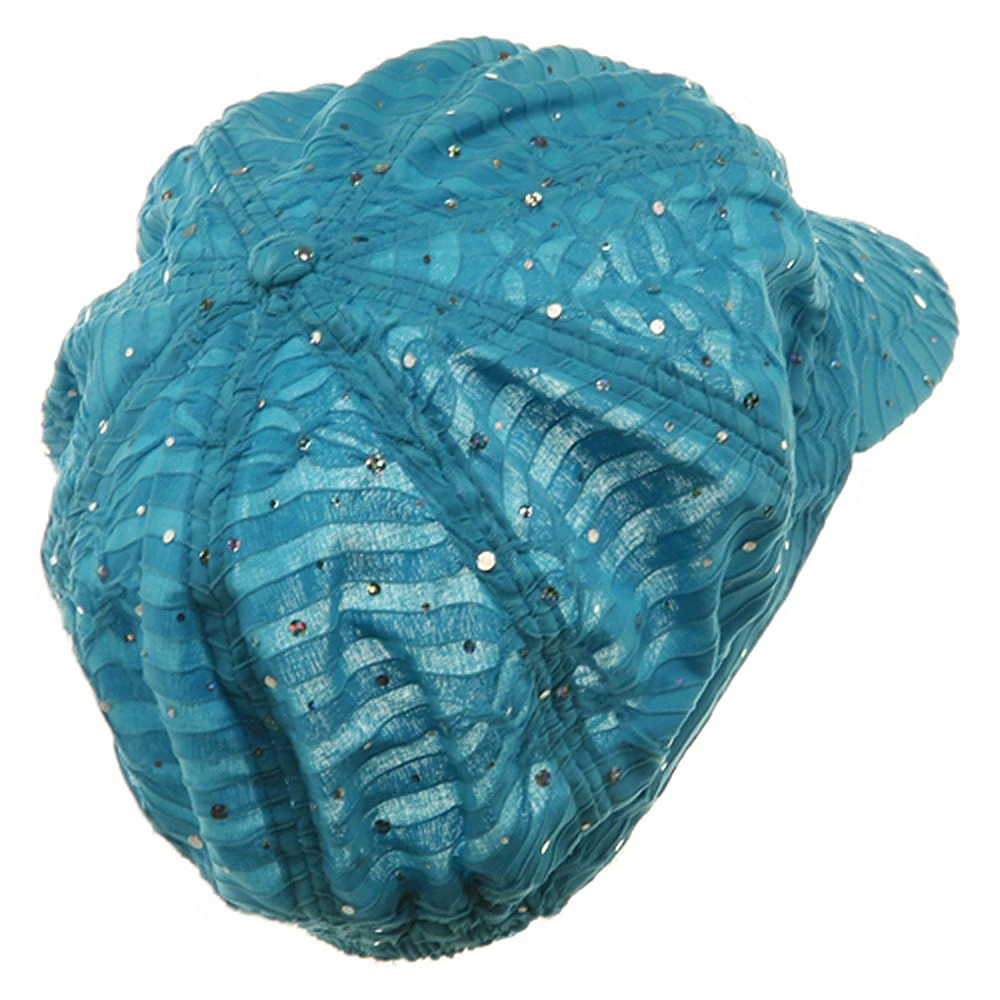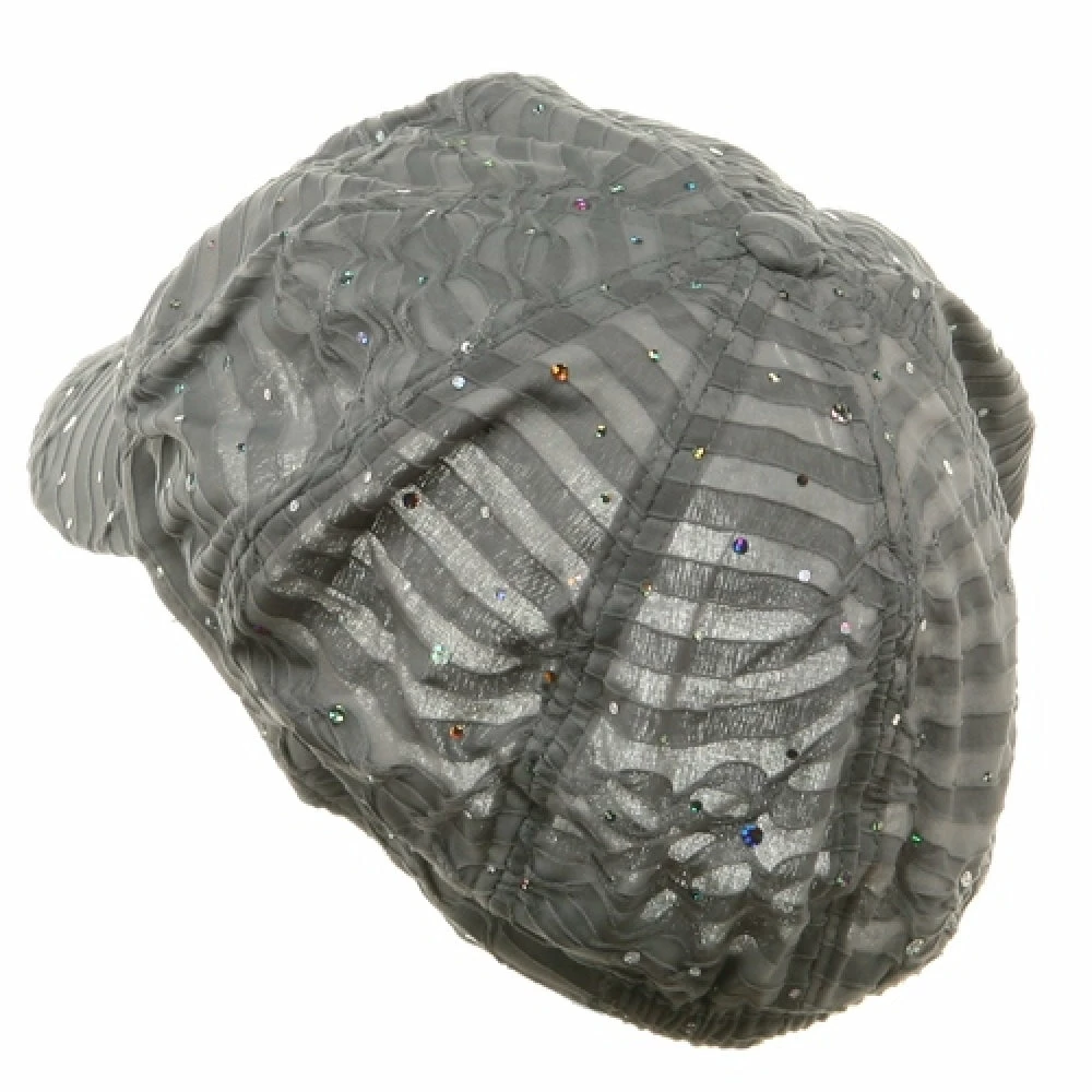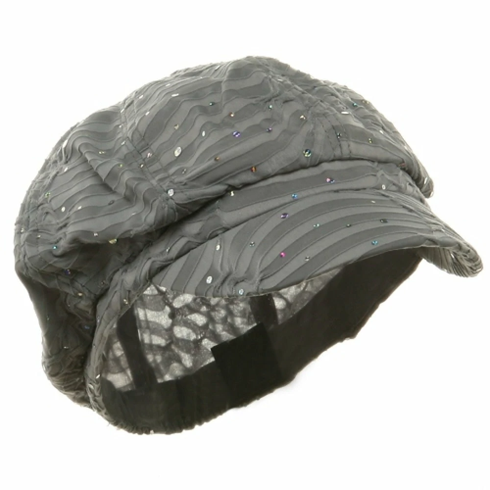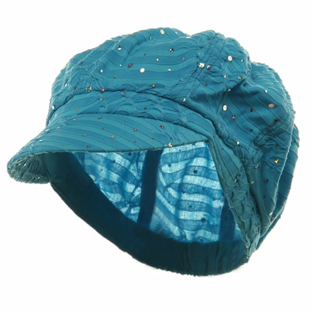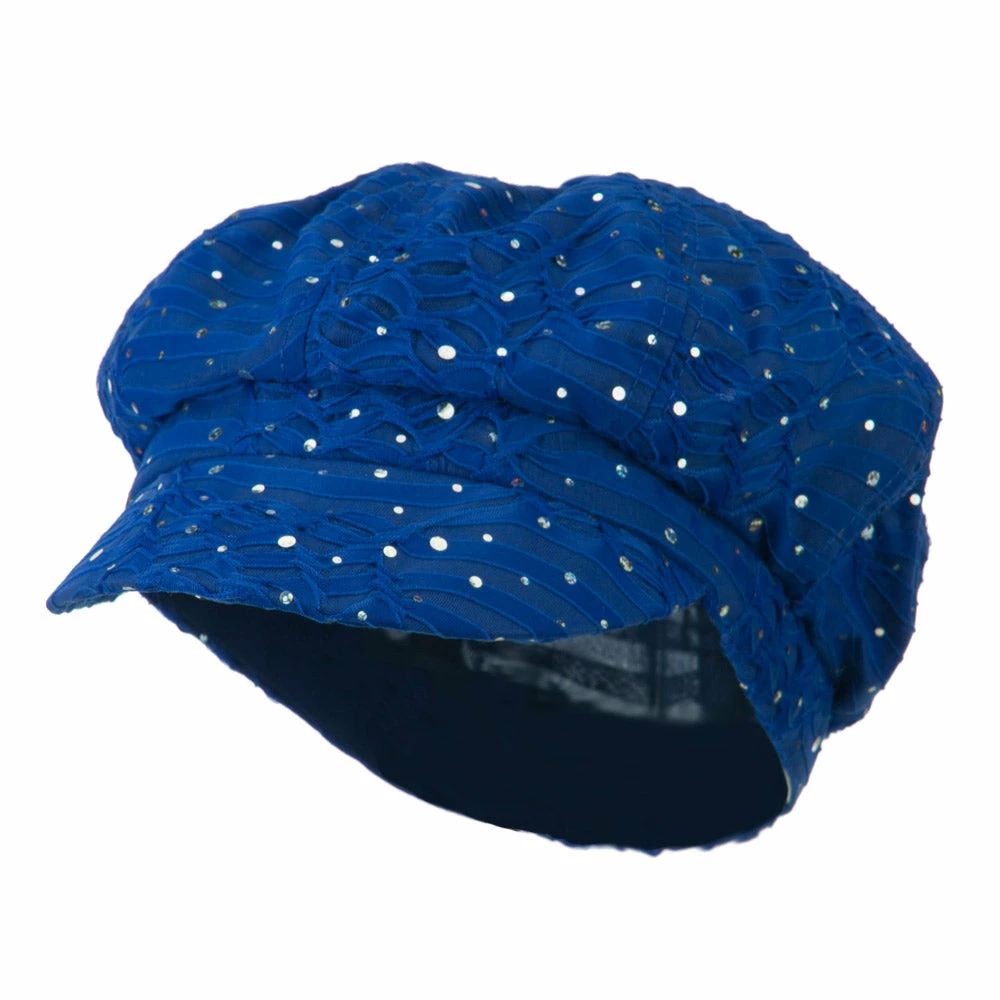 Allow yourself to sparkle and shine in our Glitter Newsboy cap. Made from a unique blend of cotton and metallic, this thin ribbed and textured hat combines the traditional look of a newsboy cap, with a modern and glamorous touch. Featuring 8 panels with a button top, this roomy 4″ deep crown is sprinkled with holographic dots from the tip of the 2 1/4′” long bill to the elastic closure in the back . Fully lined for your added comfort and luxury, this hat is definitely for those who love to make a statement. So go ahead and let yourself shine in any one of these great colors. Just be warned sunglasses are not included!