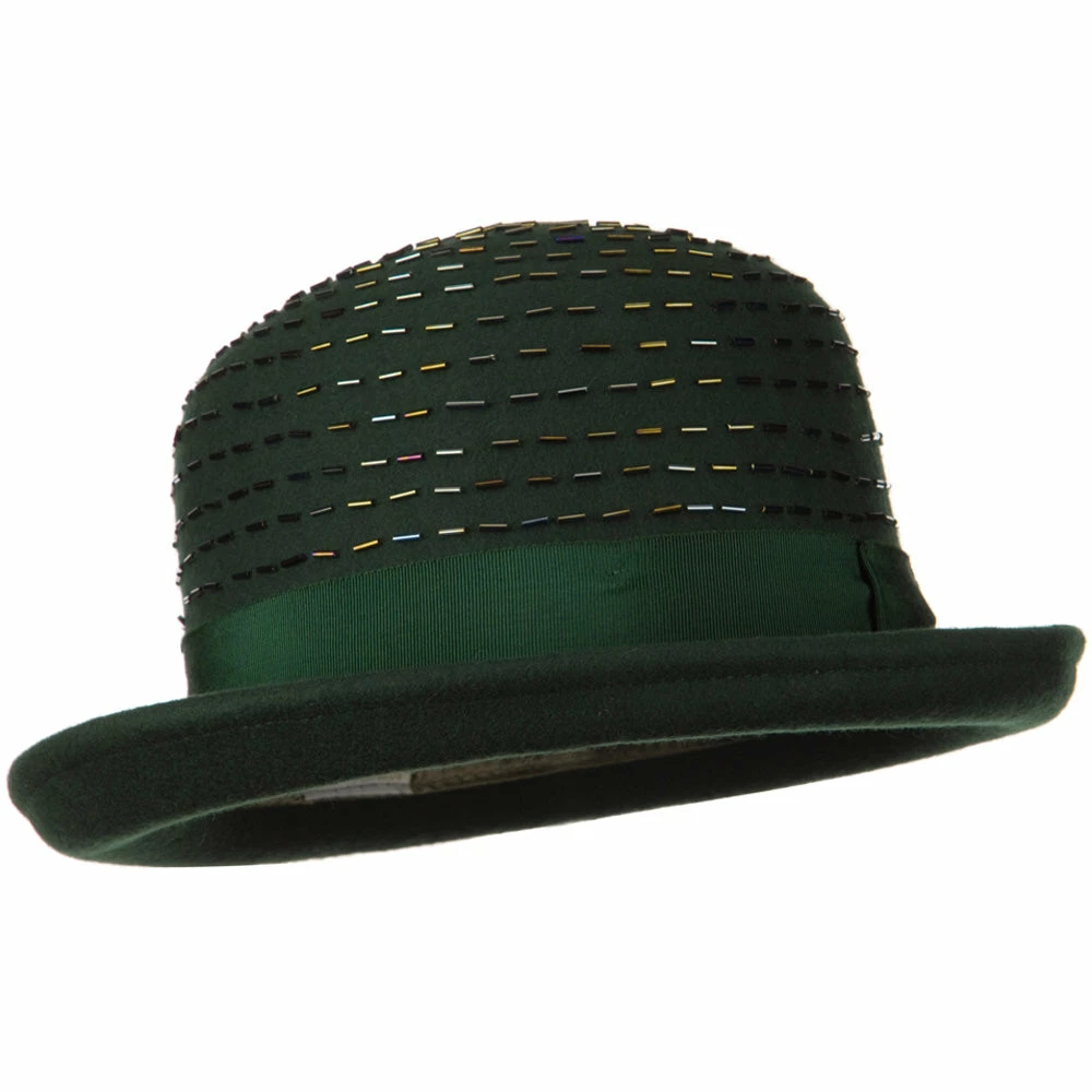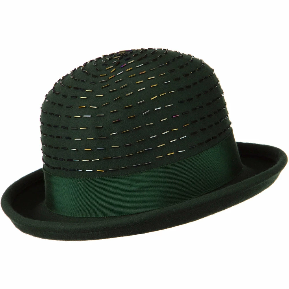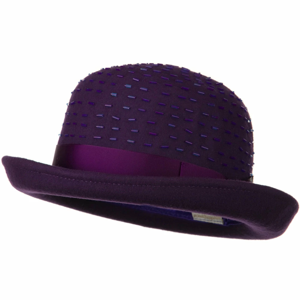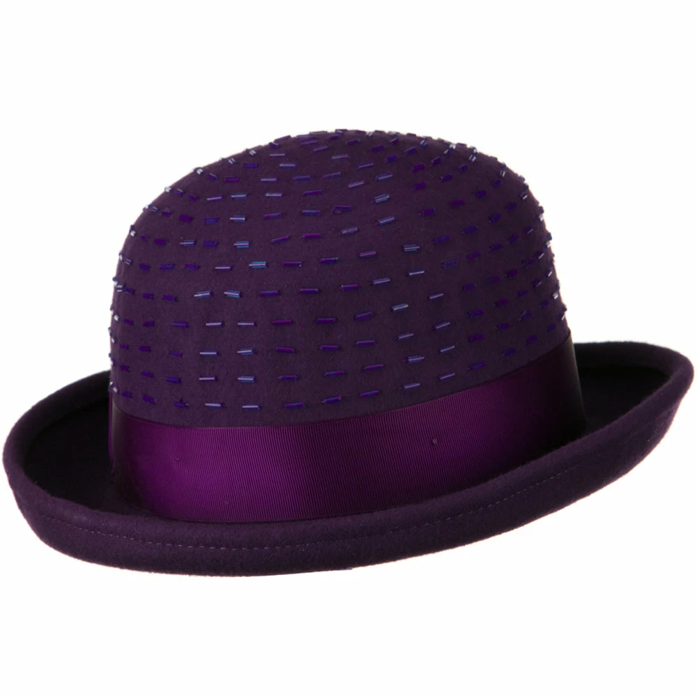 Our Solid Wool Felt Hat is a bowler style hat for ladies this fall and winter season. Featuring a round crown with upturned brim, this wool felt hat is sure to add a dressy touch to your outfits for any occasion. Solid in color, the matching hat band encircles the crown of the hat for a classic look. A unique feature about this felt hat is the embellishment on the crown with decorations. This hat is a stylish choice for any casual or special outing. Our ladies wool felt hats are also available in other beautiful colors and styles as well.