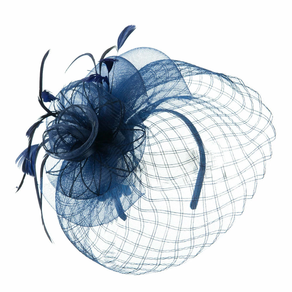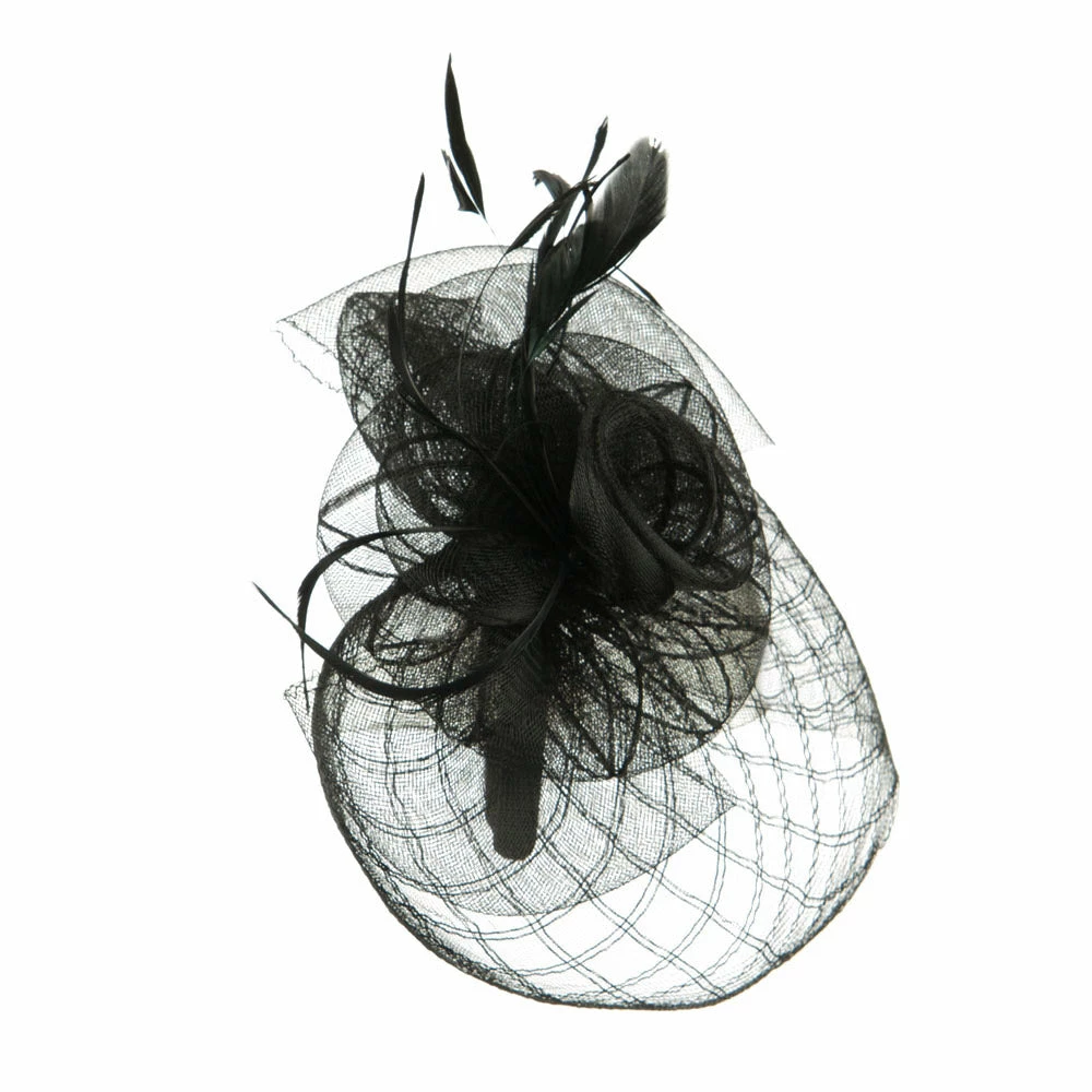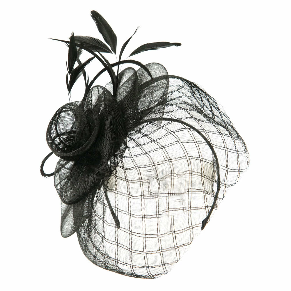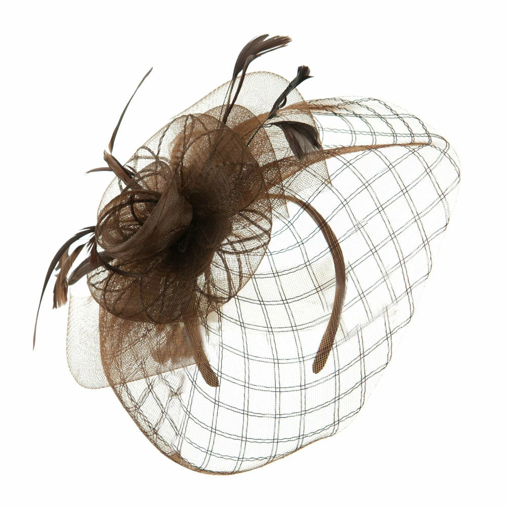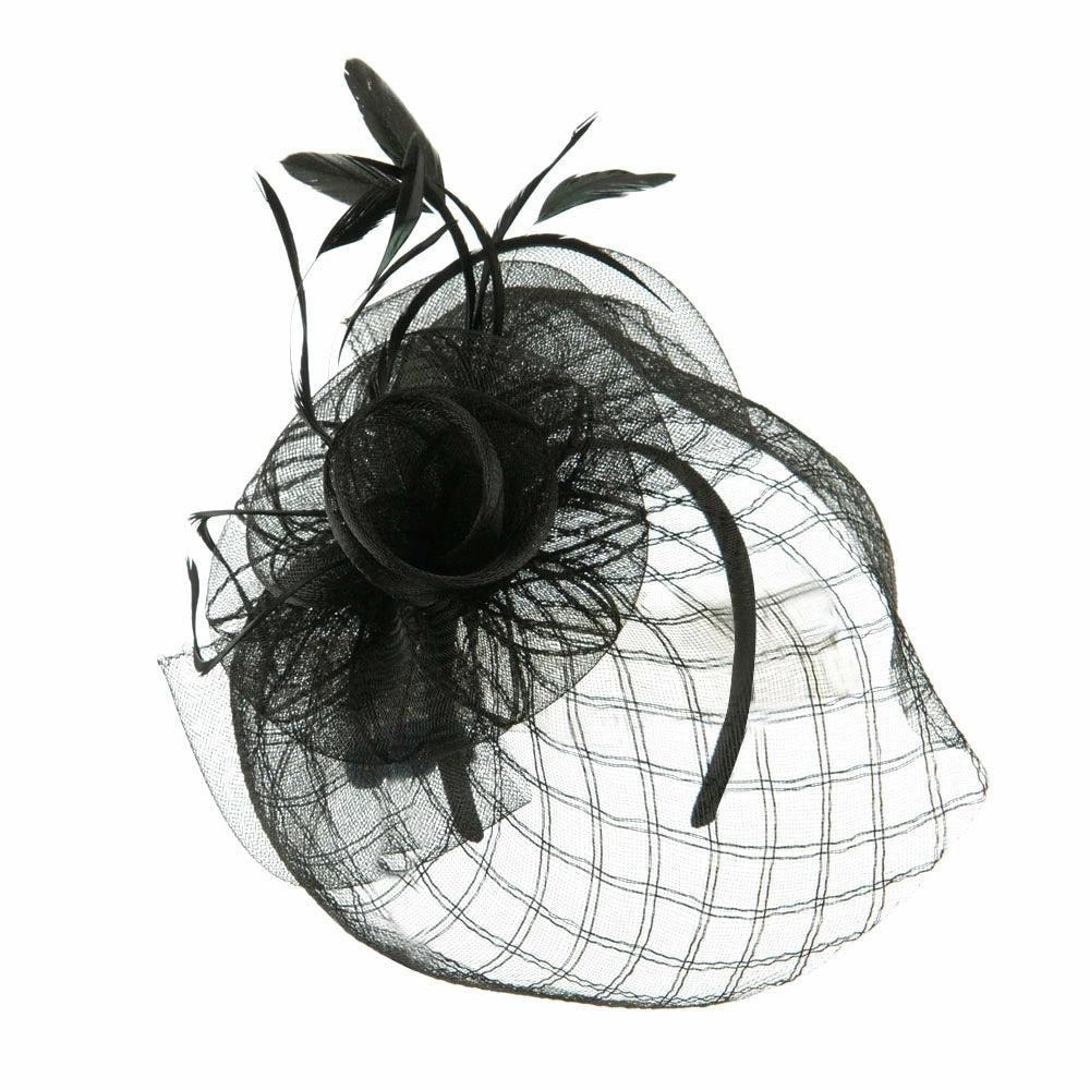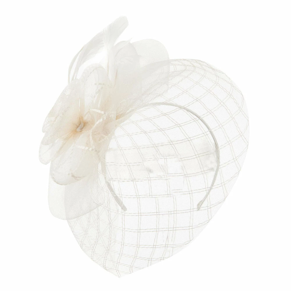 Crown of fascinator is decorated with spiral shaped net.